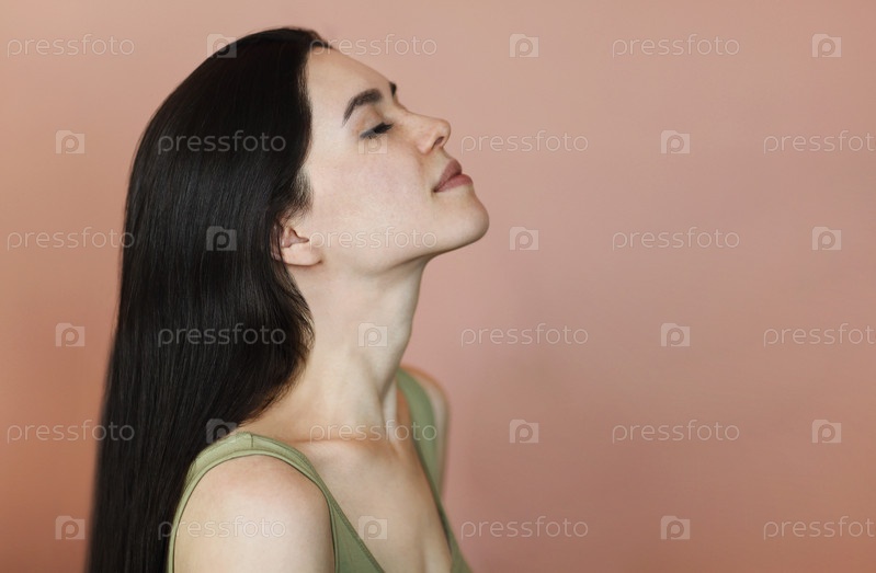 Крупным планом портрет красивой молодой брюнетки с длинными прямыми волосами в профиле