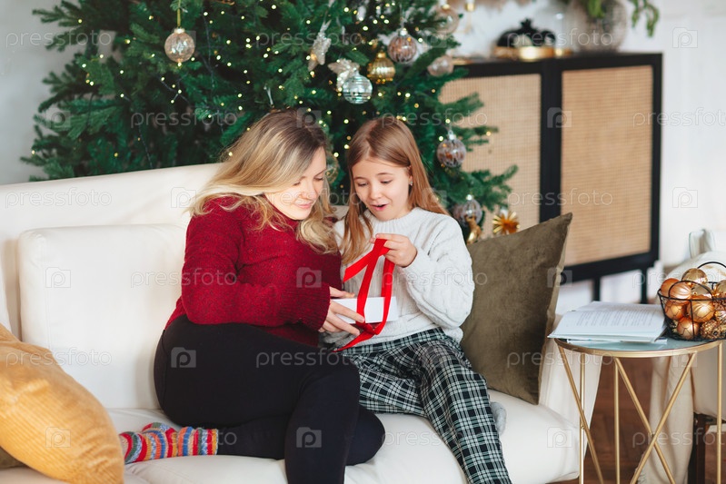 Радостная бабушка и прекрасная внучка в уютных вязаных свитерах у рождественской елки в гостиной