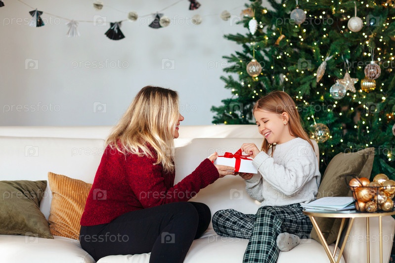 Радостная бабушка и прекрасная внучка в уютных вязаных свитерах у рождественской елки в гостиной