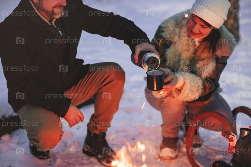 Радостная счастливая влюбленная семейная пара греется у костра на улице в зимнем снежном лесу