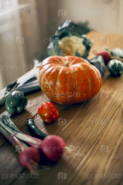 Вид сверху на свежие овощи, разложенные по кругу на деревянном столе