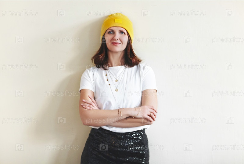 Улыбающаяся счастливая брюнетка средних лет, стоящая со скрещенными руками