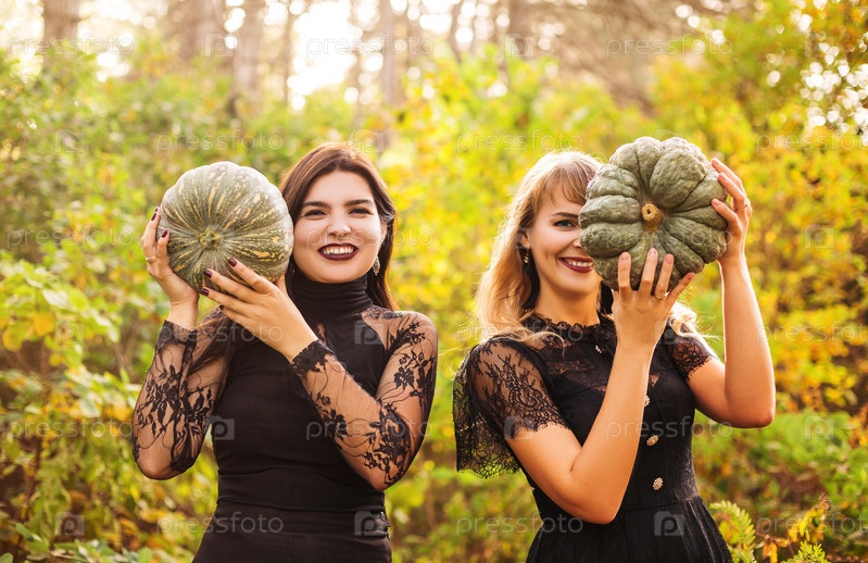Две подруги держат перед лицом страшные зеленые тыквы