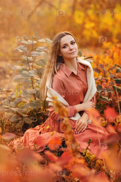 Красивая молодая блондинка в платье сидит с задумчивым взглядом в высокой траве в осеннем лесу