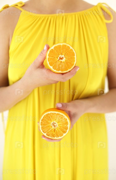 Женщина в летнем желтом платье держит в руках две половинки апельсинов