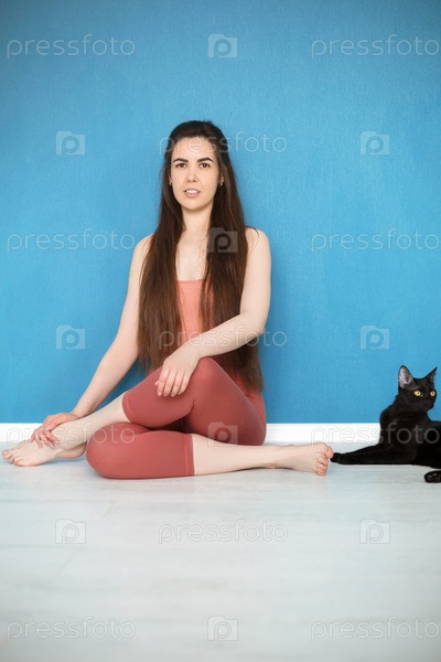 Брюнетка молодая женщина сидит у синей стены дома в позе полулотоса с черной кошкой рядом