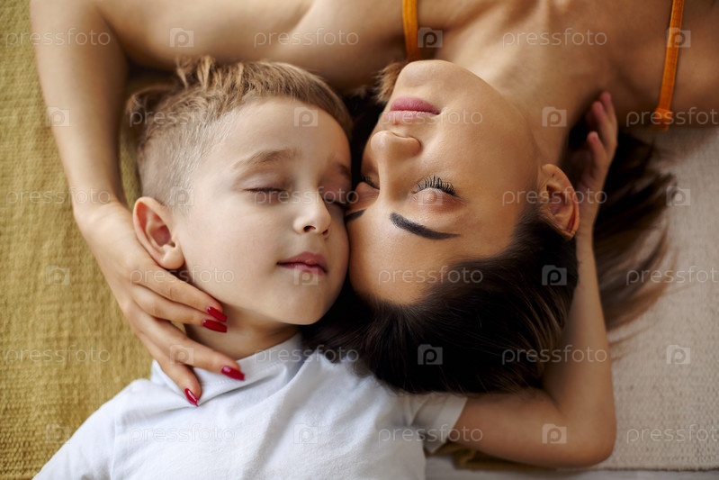 Вид сверху на молодую позитивную семейную мать и сына, смеющихся и обнимающихся, лежа на кровати