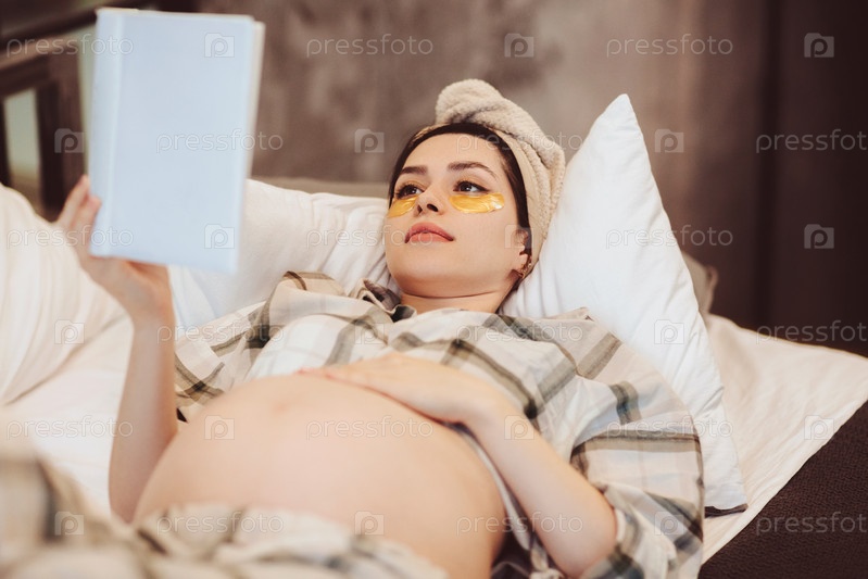 Молодая счастливая беременная женщина в пижаме читает книгу и нежно касается живота, отдыхая дома