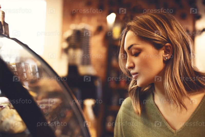 Молодая голодная женщина выбирает еду, стоя возле витрины в пекарне