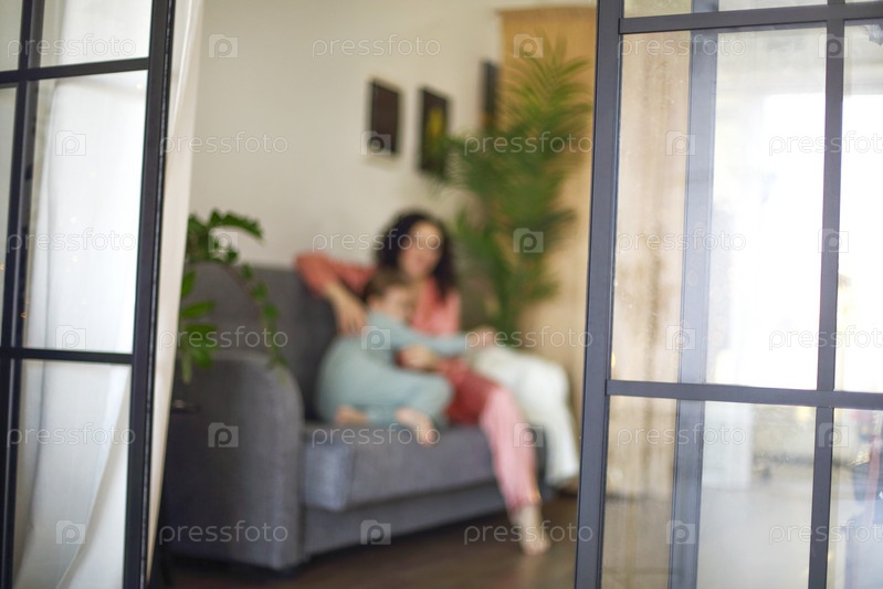 Уютная домашняя фотография счастливой матери и дочери в пижамах, отдыхающих на диване по утрам, молодой красивой мамы и маленькой девочки, проводящих ленивые семейные выходные дома