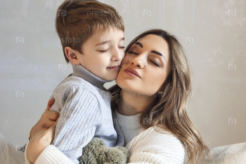 Воспитание детей с любовью. Милый семейный портрет любящей матери и маленького сына, обнимающихся, изолированных на бежевом фоне, крупным планом обнимающих маму и ребенка