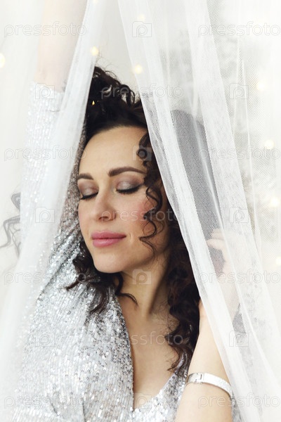 Крупный план молодой чувственной привлекательной женщины с вьющимися волосами в праздничном макияже, выглядывающей из-за белой занавески, украшенной рождественскими светодиодными огнями