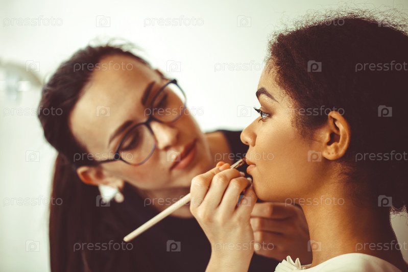 Молодая счастливая привлекательная афроамериканка в гостях у визажиста в салоне красоты, профессиональный визажист держит кисть, нанося макияж на лицо улыбающейся черной девушки