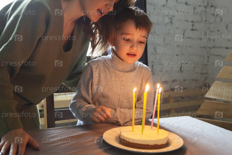 Маленький дошкольный кавказский мальчик задувает свечи на домашнем торте ко дню рождения дома, ребенок загадывает желание во время празднования дня рождения с семьей