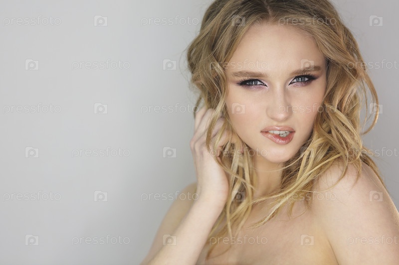 Молодая красивая женщина со светлыми вьющимися волосами на сером фоне