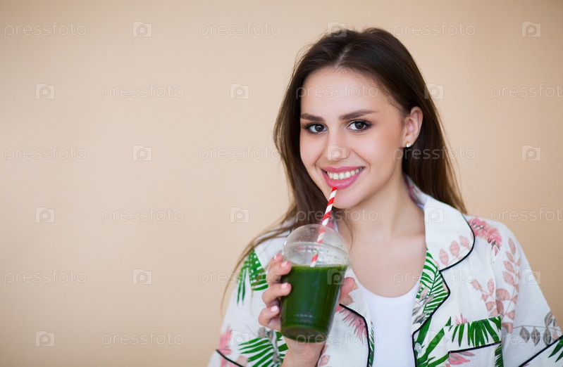 женщина с зеленым смузи смеется на фоне стены