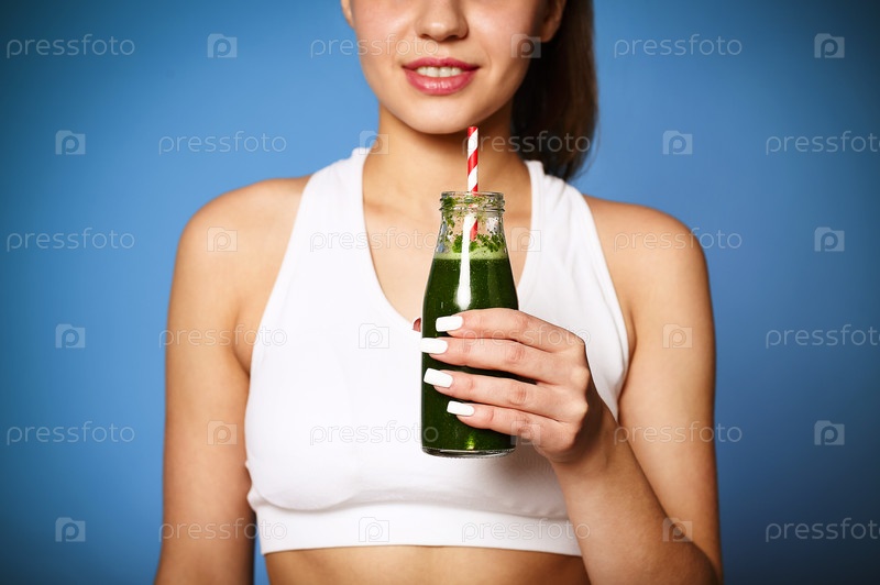 женщина с зеленым смузи смеется на фоне стены