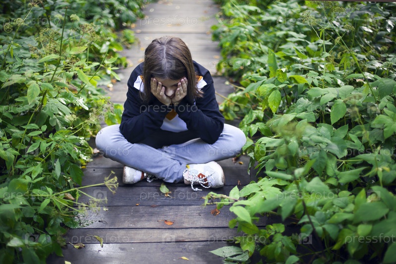 Грустная девушка сидит в саду