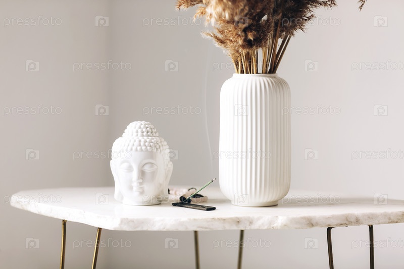 Небольшой мраморный стол с маленькой статуей головы будды и горящей ароматической палочкой на подставке