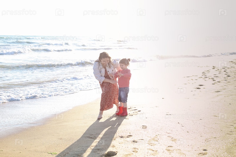 Счастливая семья из двух человек, мать и дочь гуляют по солнечному песчаному пляжу