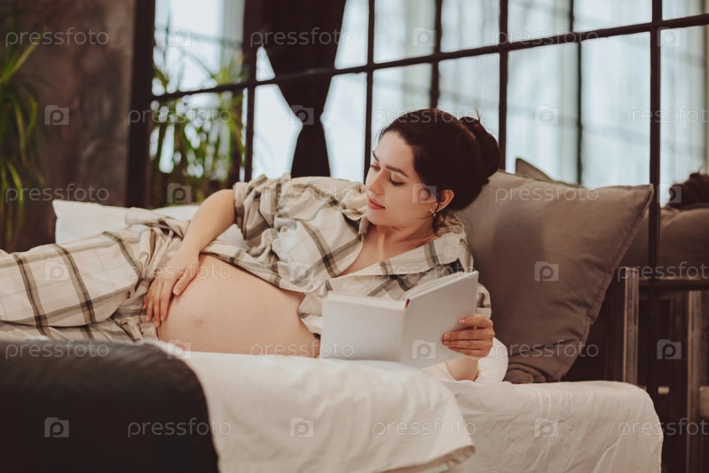 Молодая счастливая беременная женщина в пижаме читает книгу и нежно касается живота, отдыхая дома