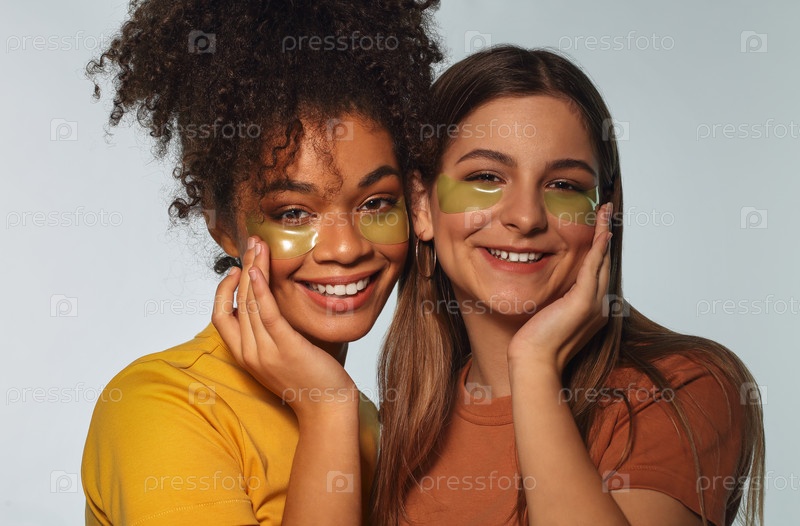 Две красивые девушки позируют близко друг к другу щека к щеке, с нанесенными под глаза гелевыми подушечками