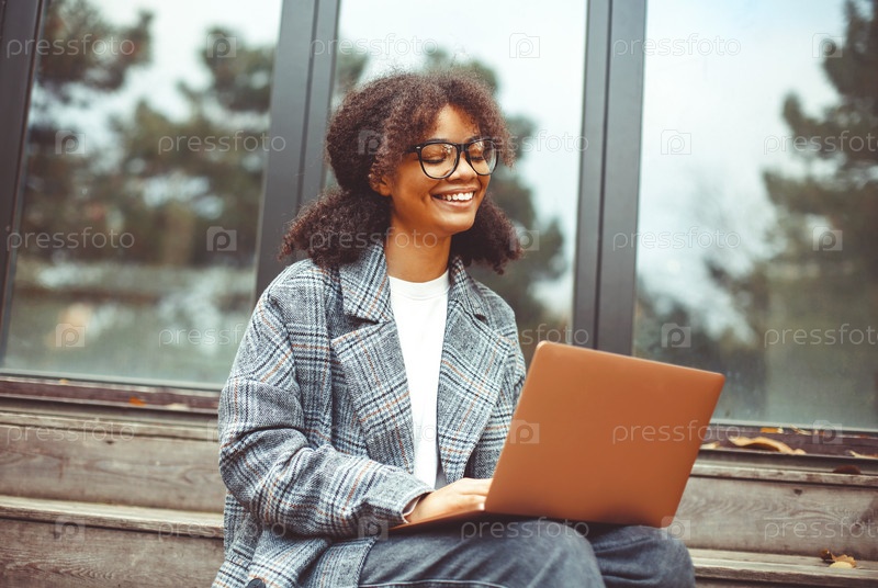 Открытый осенний портрет молодой веселой африканской американки с ноутбуком на коленях, сидящей на лестнице деревянного дома