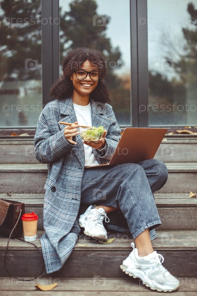 Счастливая африканская американка ест зеленый салат, работая на ноутбуке на открытом воздухе в осенний день