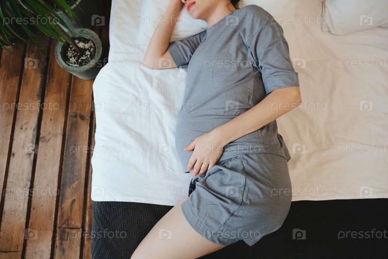 Беременная женщина отдыхает дома на диване, будущая мать лежит на диване, касаясь живота