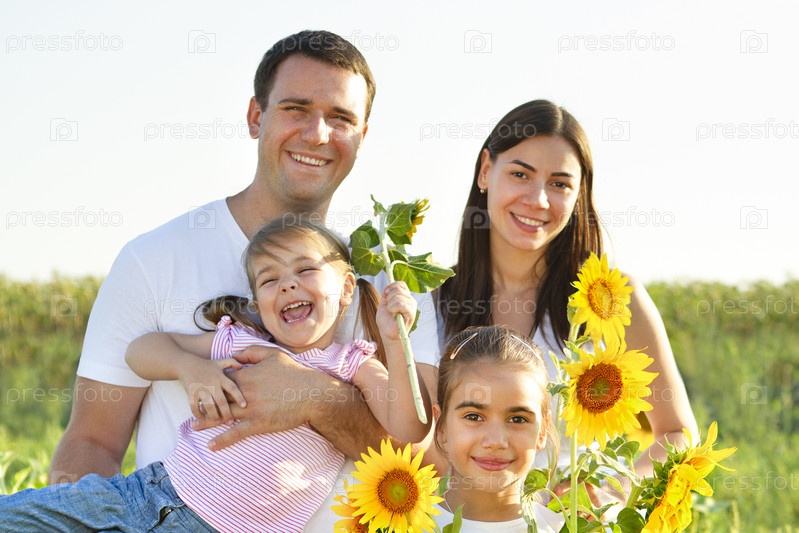 Веселая семья с подсолнухами в поле