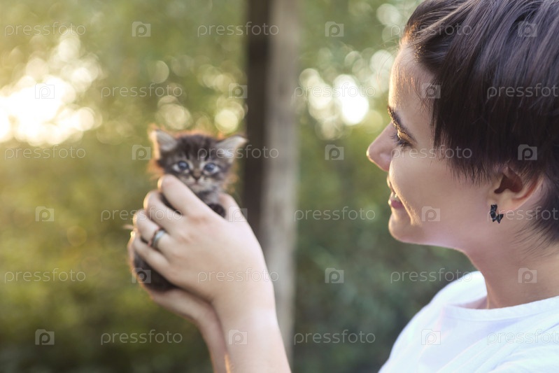 Счастливая девочка-подросток с крошечным котенком