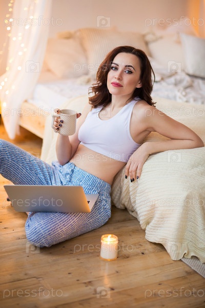 Счастливая женщина с ноутбуком и горячим напитком возле кровати