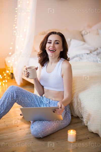 Счастливая женщина с ноутбуком и горячим напитком возле кровати