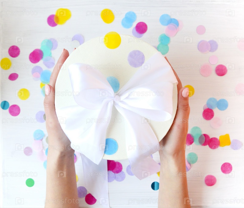 Женщина-урожай с подарочной коробкой над конфетти
