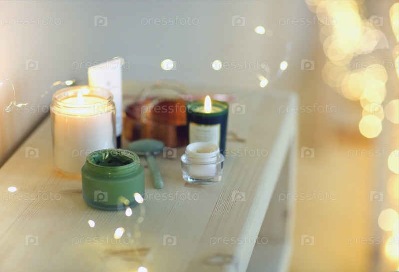 Горящие свечи и контейнеры с различной косметикой по уходу за кожей