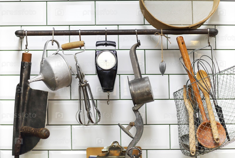 Ретро посуда вокруг раковины дома