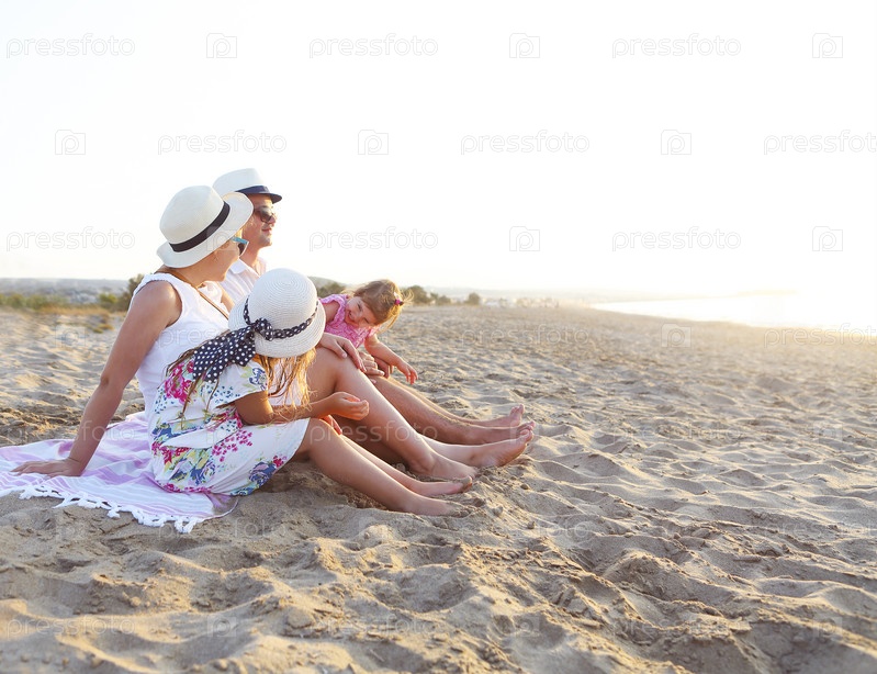 Смеющаяся семья с отцом, матерью, дочерьми, устраивающими пикник на пляже