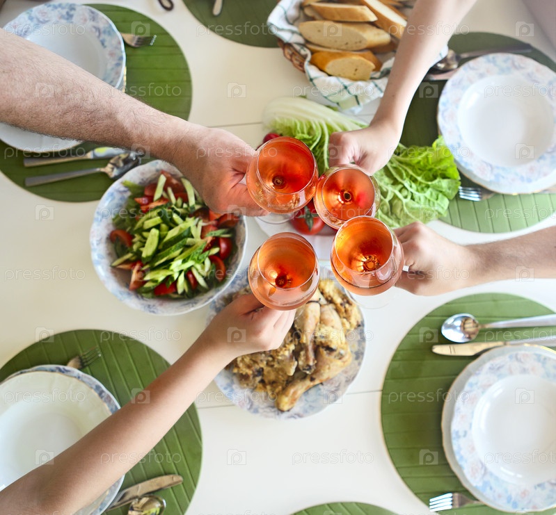 Крупный план стола с розовым вином,салатом и курицей