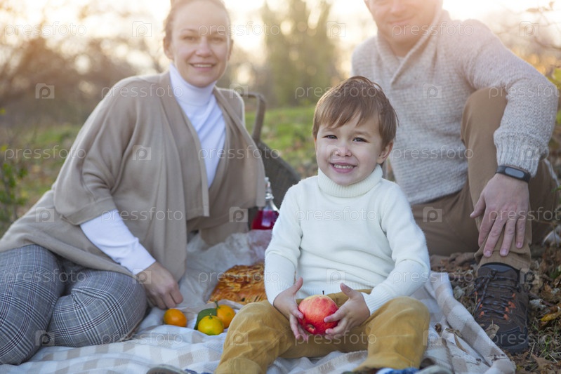 Счастливая семья вместе на осеннем пикнике