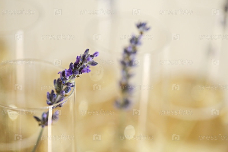 Бокалы шампанского, украшенные лавандой на размытом фоне