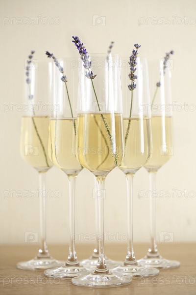 Бокалы шампанского, украшенные лавандой на размытом фоне