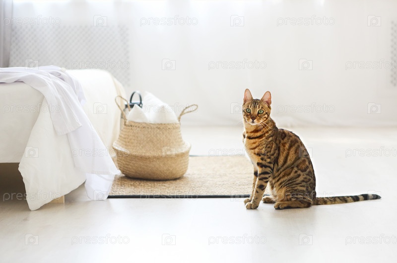 Бенгальский кот с зелеными глазами в спальне