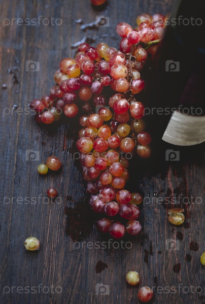 Бутылка вина и винограда на деревянном фоне
