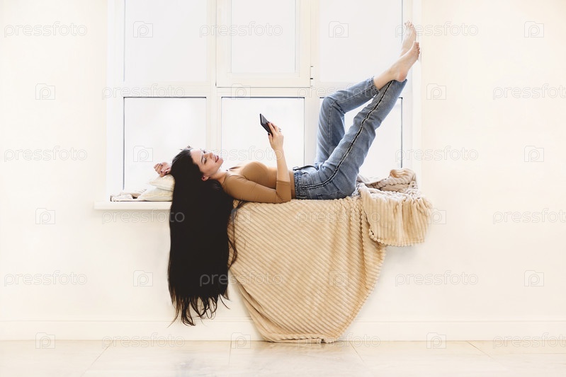 Молодая женщина со смартфоном лежит на подоконнике