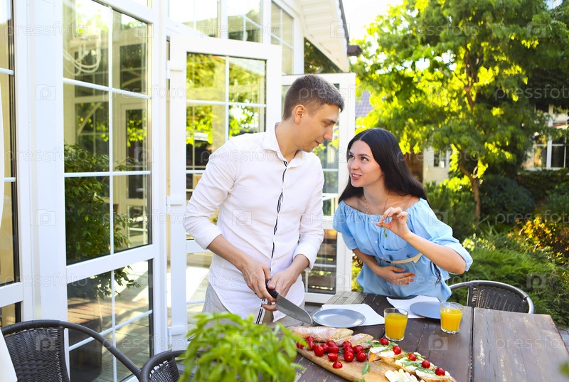 Молодая пара готовит бутерброды в саду