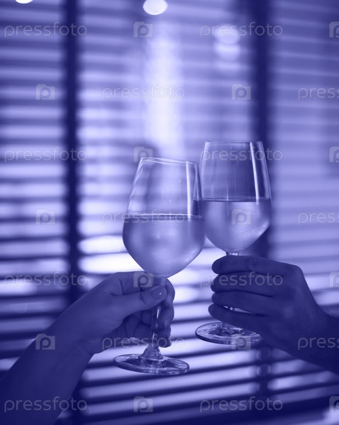 Молодая пара с двумя бокалами белого вина в постели на размытом фоне