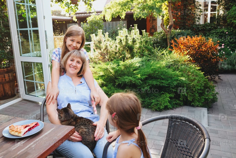 Милые маленькие девочки сидят за столом и завтракают в саду загородного дома, гладят кошку, сидящую на руках у бабушки