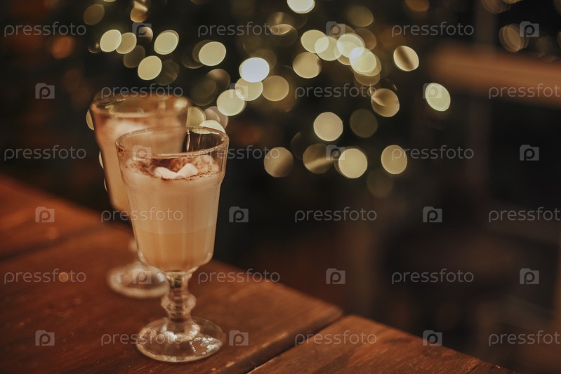 Традиционные осенние и зимние коктейли, алкогольные или безалкогольные. Два стакана коктейлей гоголь-моголь с какао и зефиром