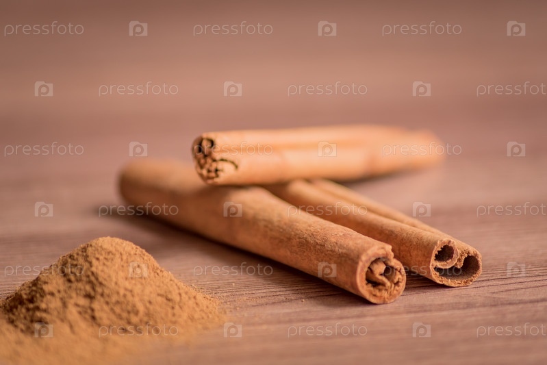 Палочки корицы и порошок на деревянном столе. Мягкий фокус