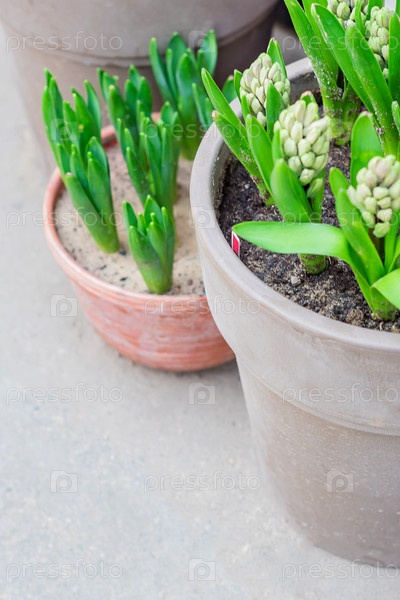 Гиацинты в горшках стоят на полу в саду. Скопируйте пространство, выберите фокус